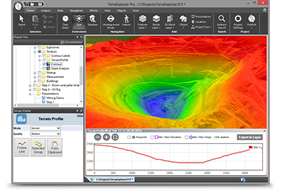 Users can navigate through and perform advanced terrain analysis and basic editing of high resolution 3D world environments created by fusing aerial and satellite photography, terrain elevation data and other 2D and 3D information layers.