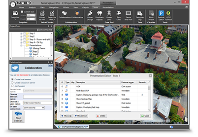 > Create presentations with customized flight routes > Use Collaboration tool for remote guided tours > Publish and extract projects to web, desktop, and mobile devices